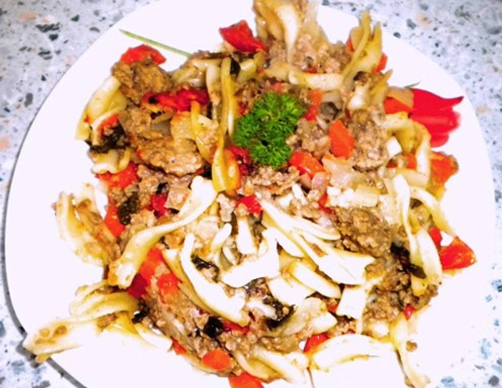 Die gekochten Nudeln gemeinsam mit allen anderen Zutaten (außer die Hälfte des Käses) in eine Auflaufform geben, vermengen würzen und für ca. 25-30 Minuten im Rohr backen. Immer wieder umrühren.