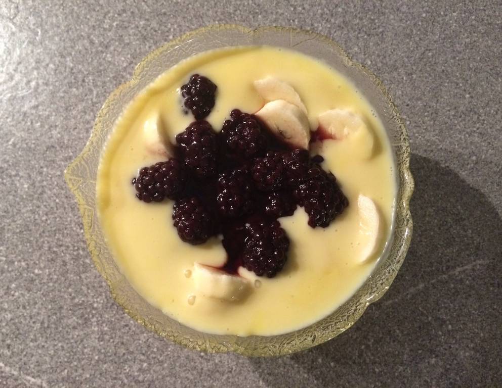- In Schalen aufteilen, Banane schälen, in Scheiben schneiden und mit den Brombeeren auf den Pudding geben.