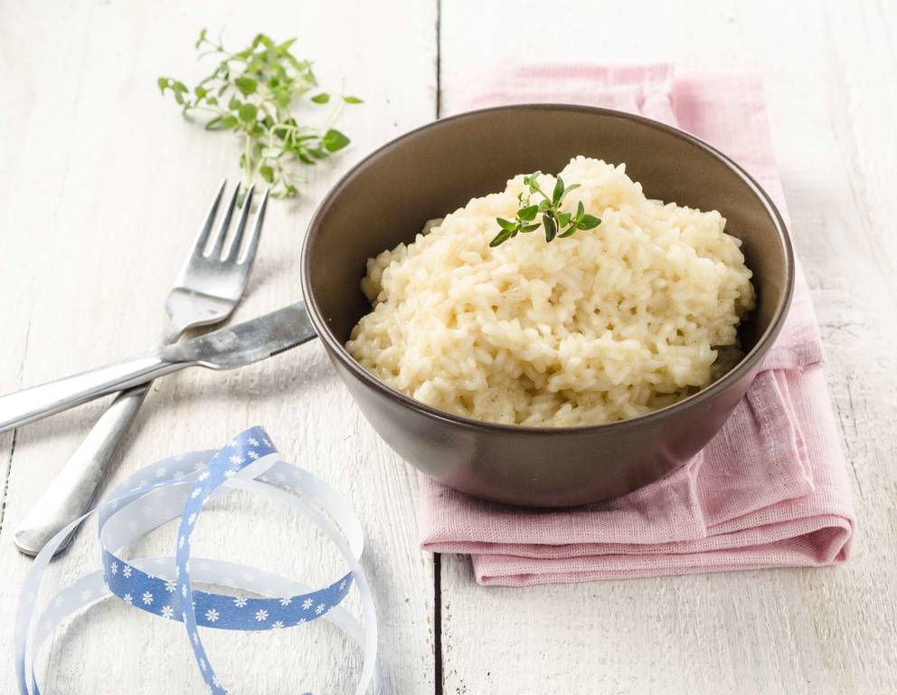 - Kurz vor dem Ende der Garzeit den geriebenen Parmesan und eventuell noch ein Stückchen Butter hinzugeben, gut verrühren und das Risotto servieren.