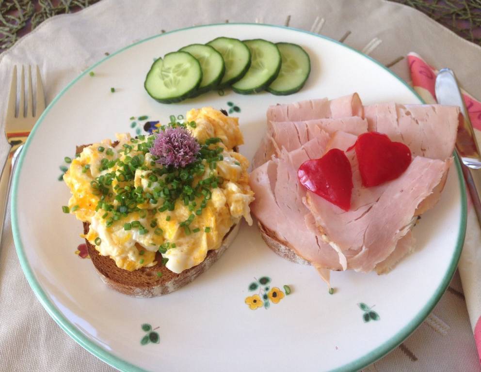 - Alles auf einem Teller nett anrichten und das Frühstück mit Ei servieren.