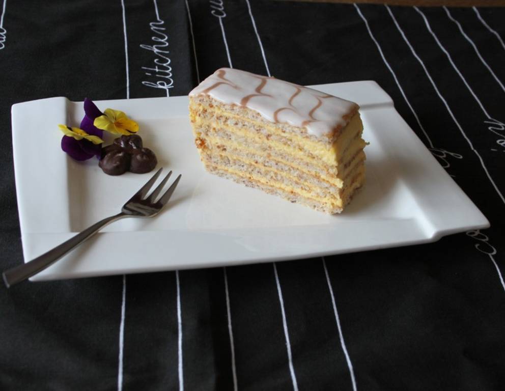 - Mit der Buttercreme bestreichen, den zweiten Streifen vorsichtig lösen, auf den mit Buttercreme bestrichenen legen, wieder Buttercreme und so weiter, bis alle Teigstreifen und die Buttercreme aufgebraucht sind. Die letzte Schicht sollte Teig sein.