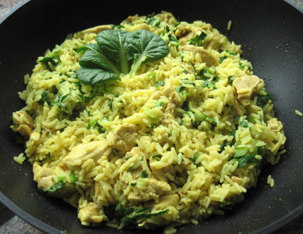 Anstatt mit Pak Choi kann man das Curryhuhn auch mit jungen Blattspinat, Mangold oder Rucola zubereiten.