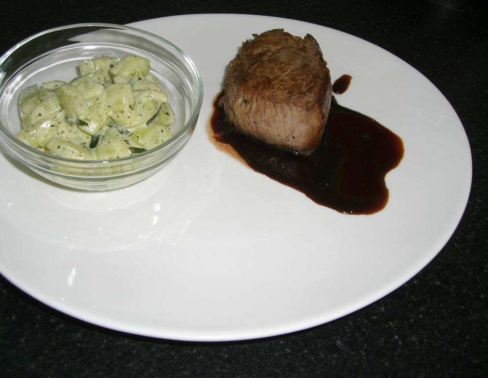 Das Filetsteak an Rotweinreduktion kann man nach Belieben noch mit Kartoffeln als Beilage servieren.