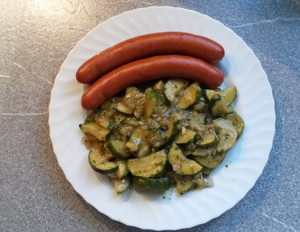 - Für das Zucchinigemüse die Zucchini waschen,d er Länge nach halbieren und in Scheiben schneiden. Die Zwiebel schälen und kleinwürfelig schneiden.