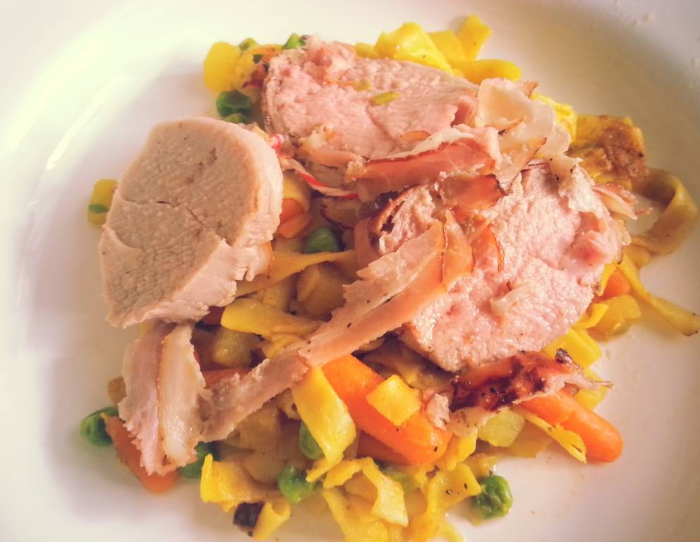 - Bandnudeln in gesalzenem Wasser kochen und abschrecken. Die Nudeln in einer Pfanne mit dem aufgetautem Tiefkühlgemüse anbraten und mit Salz, Pfeffer, gelben Currypulver und roter Currypaste abschmecken.