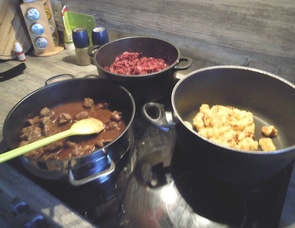 - In einer Pfanne ausreichend Öl erhitzen und Nudeln goldbraun ausbacken. Schupfnudeln mit Ragout auf einem Teller anrichten und das Rotkraut in einer kleinen Schüssel extra dazureichen.