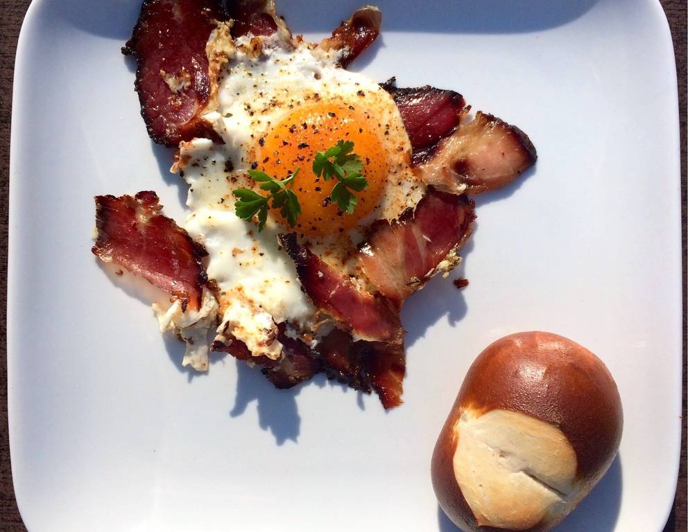 Statt des Kurkuma kann auch eine Messerspitze Currypulver für das Spiegelei mit Speck verwendet werden.