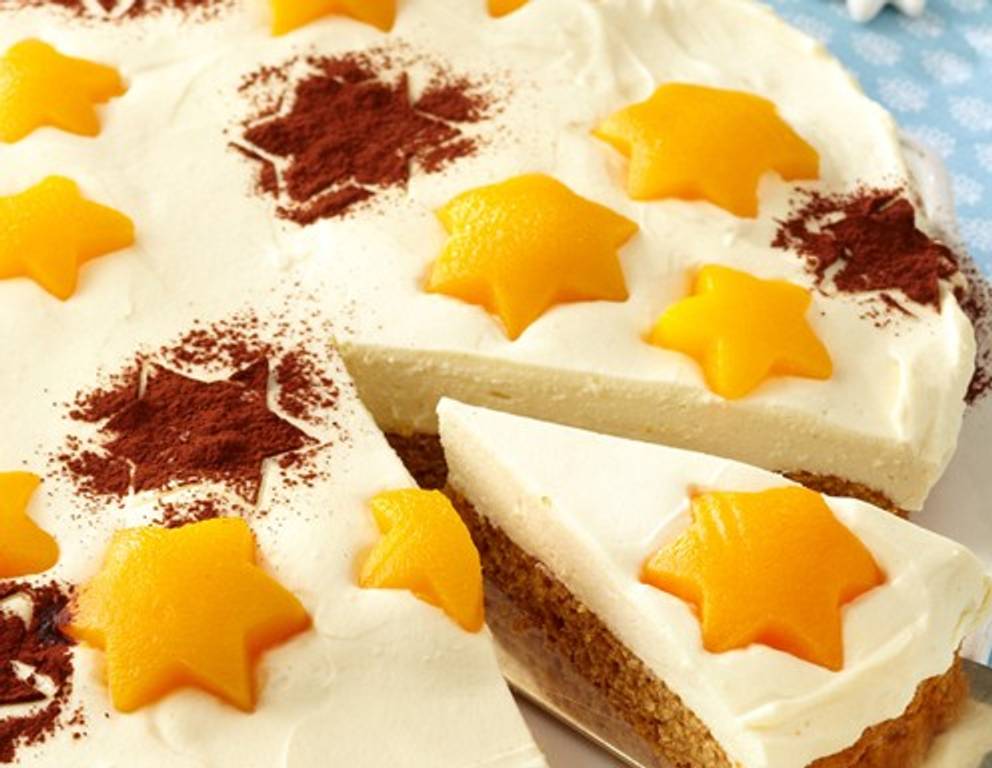 - Die Gelatineflüssigkeit unter die Mascarponemasse rühren. Schlagobers steif schlagen, ebenfalls unter die Mascarponemasse heben und diese auf den Tortenboden geben und glattstreichen. Die Pfirsichsterne sofort auf der Mascarponefüllung verteilen und in die Creme drücken.