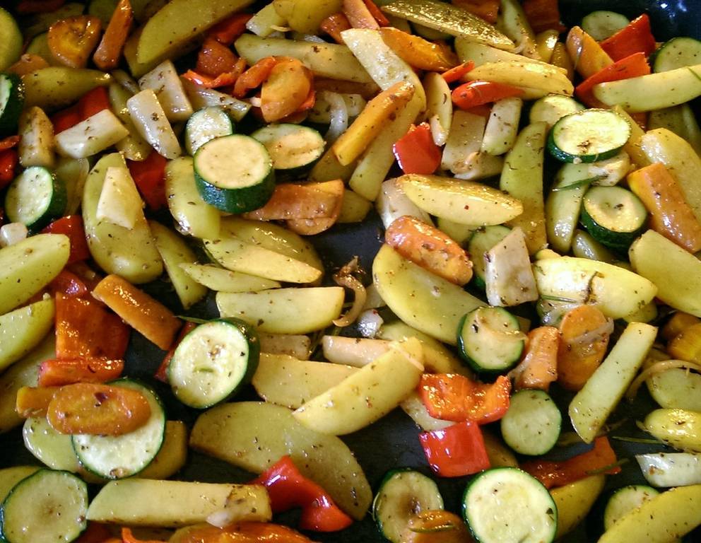- Das Backrohr auf 160 °C vorheizen. Die Kartoffeln, Karotten und Kohlrabi aus der Schüssel fischen und ca 25 Minuten vorbacken, danach das restliche Gemüse hinzugeben und für ca. weitere 10 Minuten mitschmoren. (Kostproben machen!)