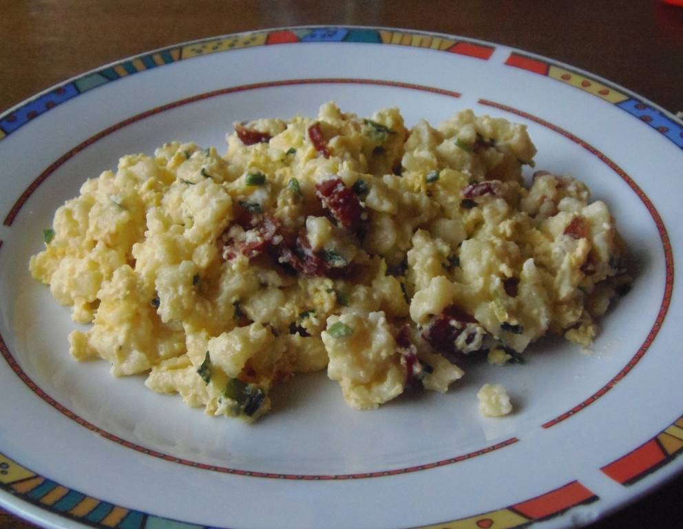 - Die restlichern Eier mit Sauerrahm verquierlen, mit Salz und Pfeffer würzen. Die Knabbernossi in kleine Scheiben schneiden.