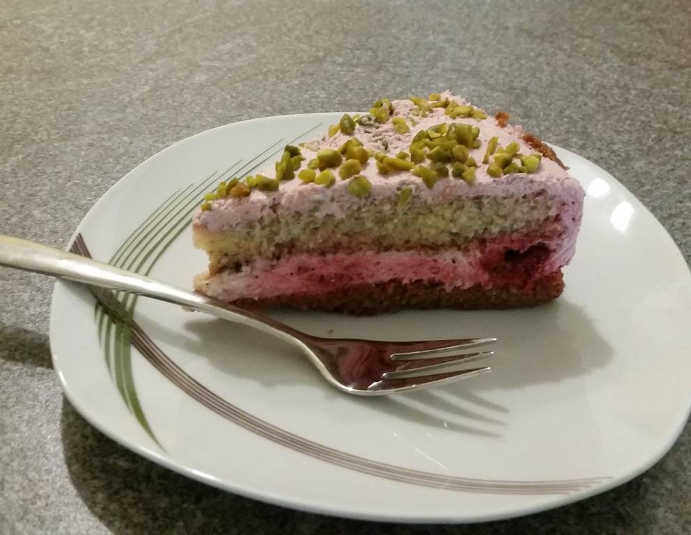 - Den hellen Biskuitboden darauflegen und leicht andrücken. Oben auf die Joghurtmasse ohne Himbeeren verteilen und glatt streichen. Die Oberfläche mit den gehackten Pistazien bestreuen.