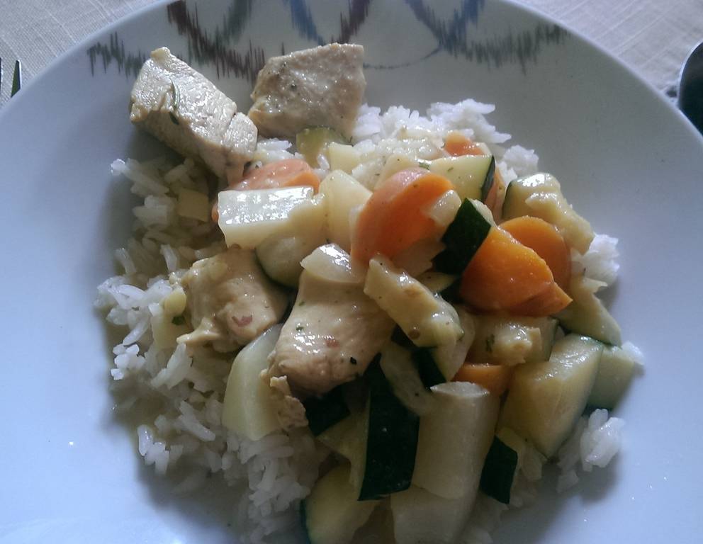 - Hühner-Gemüsecurry und Reis anrichten und servieren.