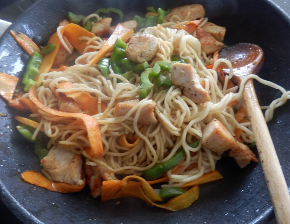 Man kann die Gemüse-Pute-Nudelpfanne auch ohne Fleisch zubereiten.