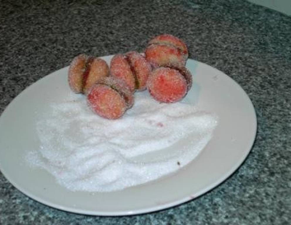 - Etwas Lebensmittelfarbe mit ein bisschen Milch oder Wasser vermischen und die Kekse darin wenden. Die gefüllten Pfirsiche anschließend im groben Zucker wenden.