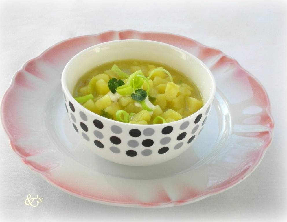 - Die Kartoffeln waschen, schälen, in Würfel schneiden und zum Lauch geben. Mit der Suppe aufgießen und bei hoher Temperatur etwa 15 Minuten kochen lassen.