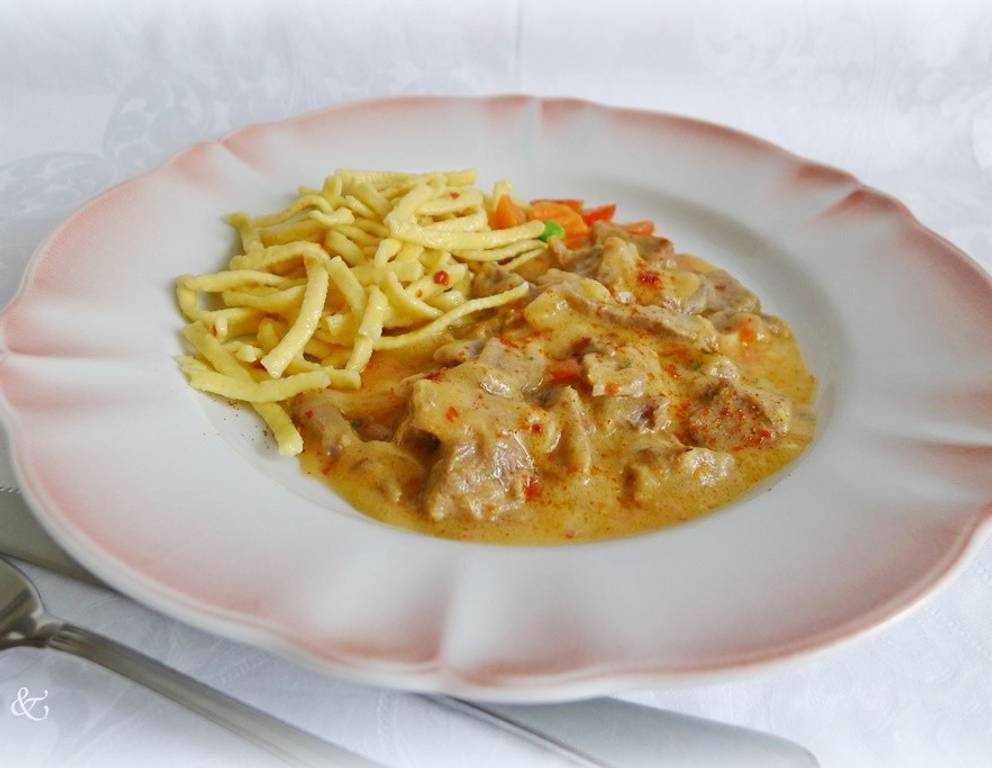 - Paprikapulver und Tomatenmark hinzugeben und mit Suppe und dem Sauerrahm aufgiesen. Einige Minuten einköcheln lassen.