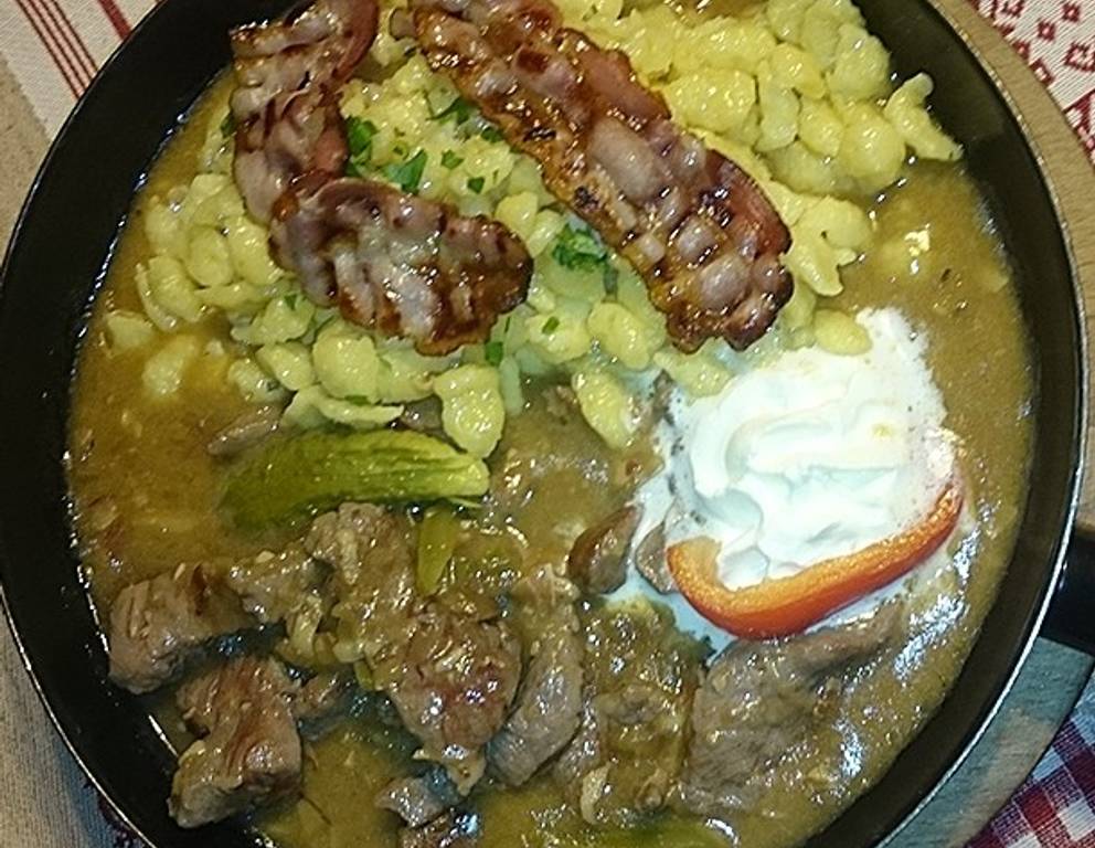 - In den letzten 5 Minuten das Fleisch mitköcheln lassen. Obers zufügen, die Soße dicklich einköcheln und mit den Gewürzen abschmecken.