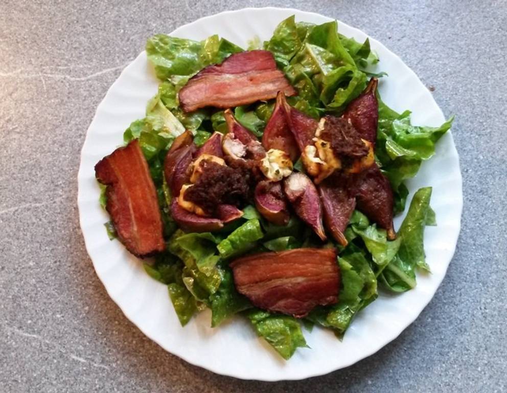 - Speck in einer Pfanne braten und mit den gebratenen Feigen auf den Salat legen.