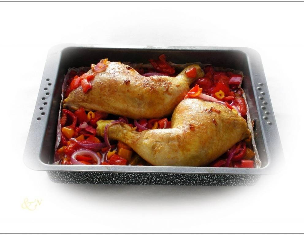- Für das Ofen-Huhn das Backrohr auf 190 Grad vorheizen. Das Gemüse, waschen, in grobe Stücke schneiden und mit den Hühnerschenkeln in eine Auflaufform geben.