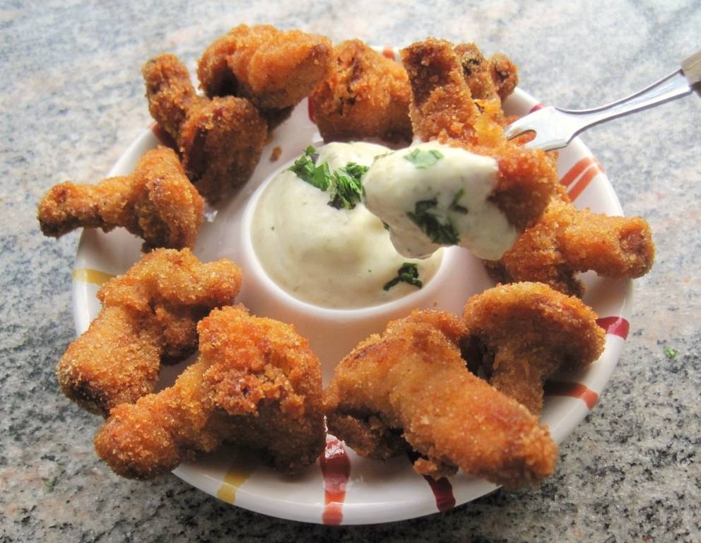 Gebackene Eierschwammerl isst man am besten mit Sauce Tartare.