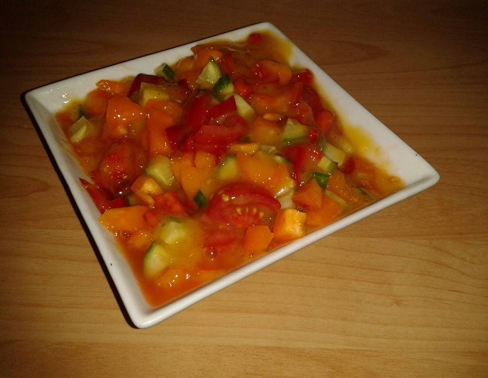 - Tomaten, Paprikas und Gurke in Würfel schneiden und mit der Sauce vermischen. Anrichten und genießen!