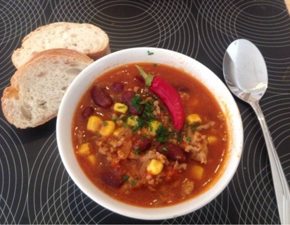 - Jetzt die Bohnen und den Mais zugeben und alles erneut für ca. 15 Minuten einköcheln lassen. Mit Cayennepfeffer abschmecken und mit Sauerrahm garniert anrichten.