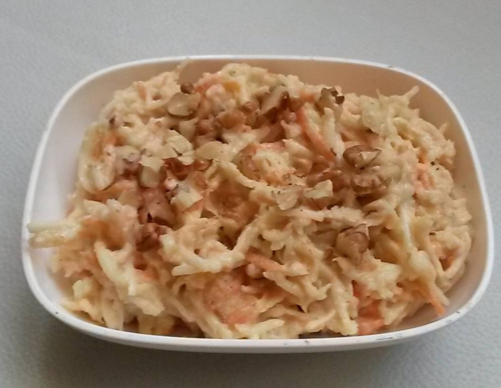 - Die Walnüsse in Scheibchen schneiden, die Karotte ebenfalls raffeln. Alle Zutaten mit der Mayonnaise vermischen. Eventuell noch salzen und pfeffern.