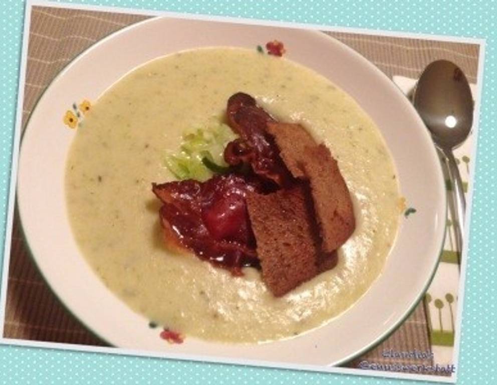 - Wenn die Erdäpfel weich sind, Creme Fraiche einrühren und die Suppe mit dem Stabmixer pürieren. Mit Salz und Pfeffer abschmecken. Die Suppe in tiefen Tellern anrichten und mit den Lauchstreifen und Speckchips garnieren.