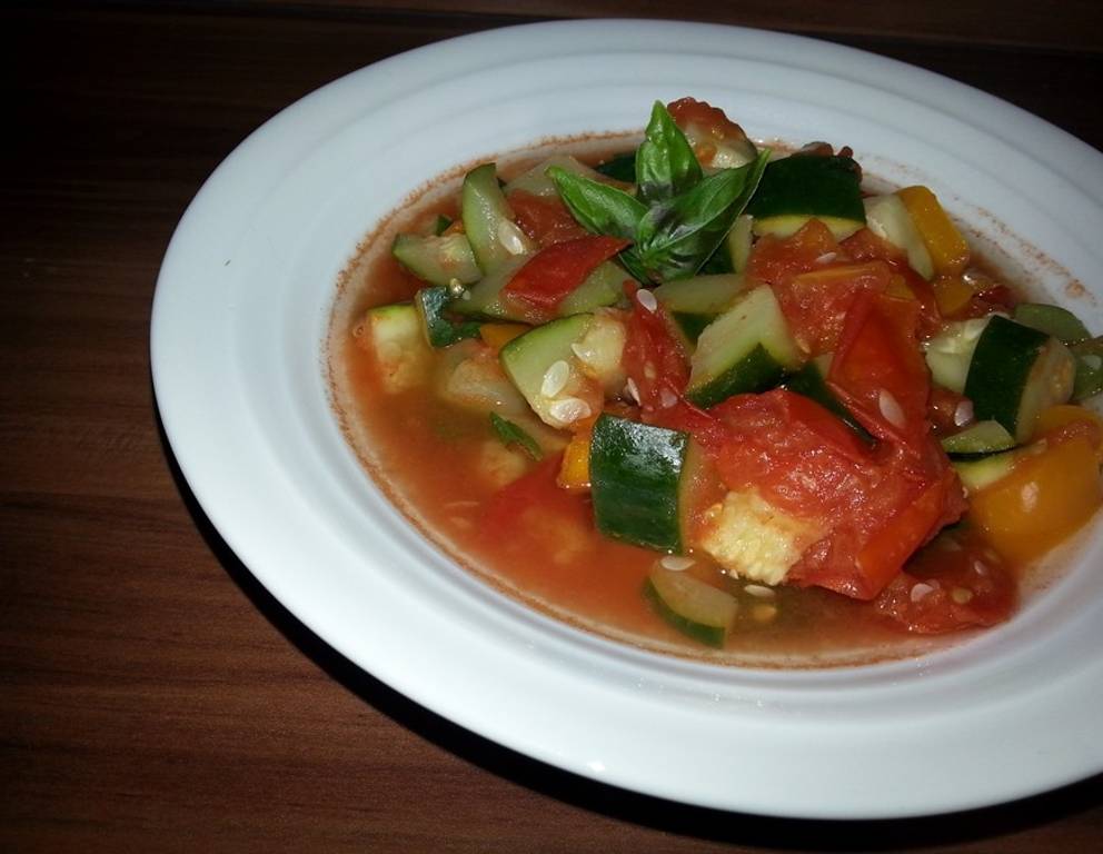 Diese Minestrone ist ganz ohne Fett. Mit Kräutern nach Belieben anrichten und am besten gleich sofort verzehren da sich ein roter Rand von den Tomaten am Teller bildet der dann nicht mehr so ganz schön aussieht, dem Geschmack aber auch nichts anhat.