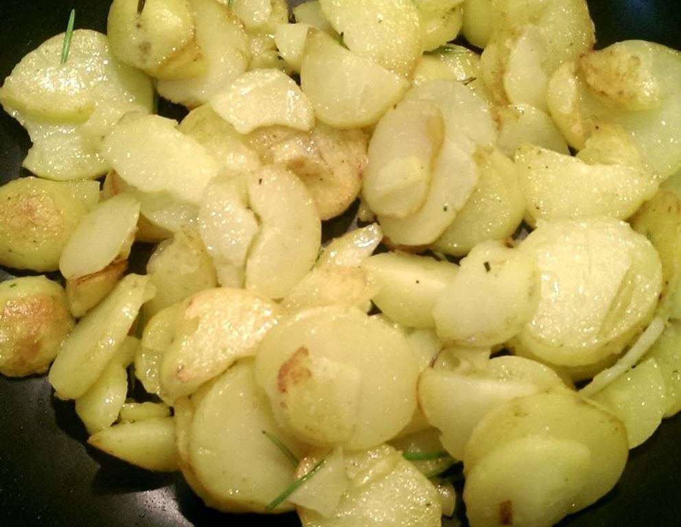 - Für die Bratkartoffel die Kartoffeln vom Vortag schälen und in Scheiben schneiden oder hobeln. Olivenöl in einer Pfanne erhitzen. Kartoffeln ind as Öl geben und gut braun anrösten.