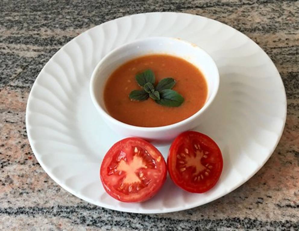 Die blitzschnelle Tomatensuppe eventuell mit einem Klecks Sauerrahm servieren. Gut dazu passen auch Croutons oder einfach frisches Weißbrot (Ciabatta oder Baguette).