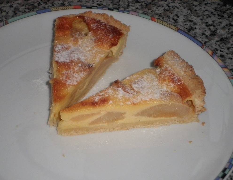 - Die Zutaten für die Creme glatt verrühren. Birnen schälen und je nach Größe vierteln oder achteln. Den Mürbteig mit den Birnenstücken dicht belegen, die Creme darübergießen und bei 160 Grad ca. 1 Stunde backen, bis die Oberfläche leicht gebräunt ist.