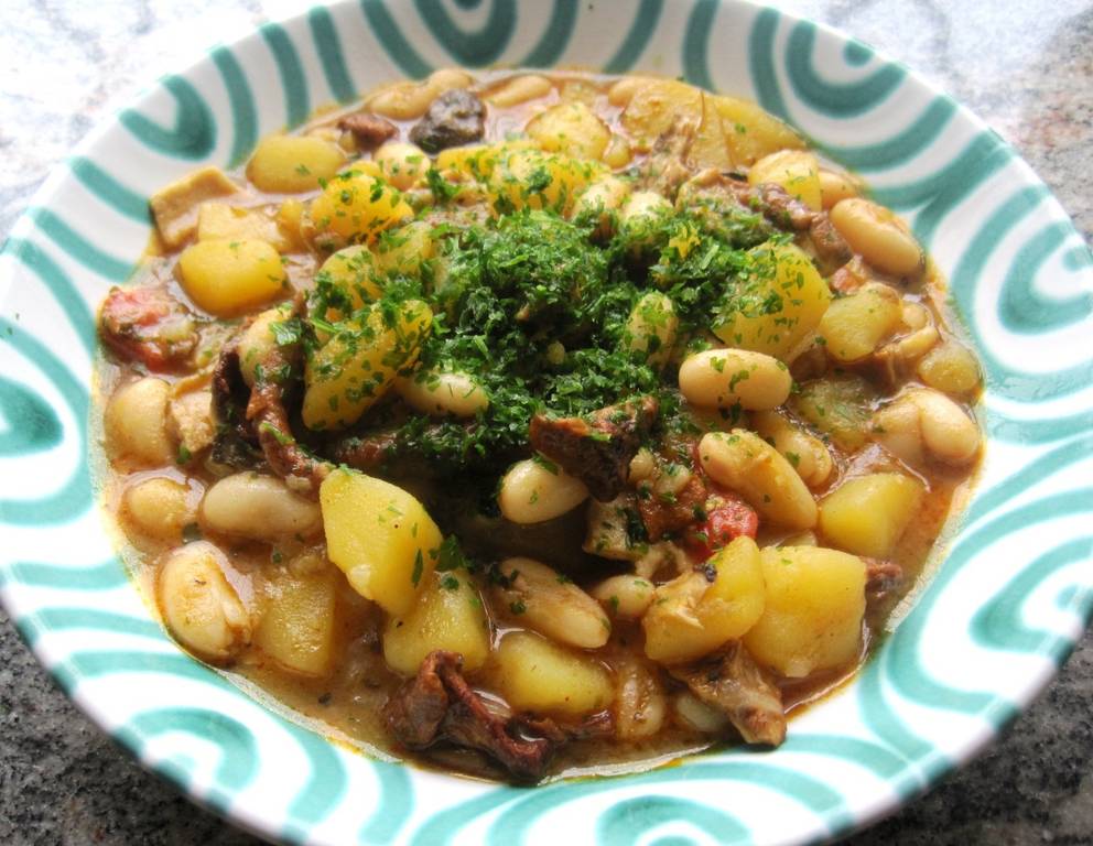 Wer unbedingt möchte, gibt mit den Bohnen auch noch 2 Paar in Scheibchen geschnittene Debreziner ins Kartoffelgulasch.