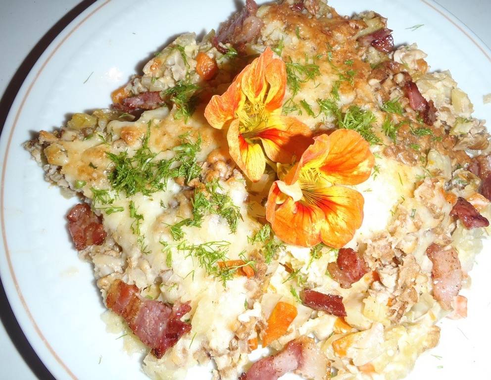 - Den geriebenen Käse in die Eimasse mengen und diese über das Gemüse gleichmäßig verteilen. Mit einer Alufolie abdecken und bei ca. 200 ° backen.