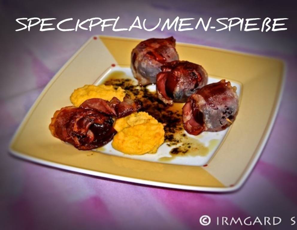 - Für die Speckpflaumenspieße die Pflaumen waschen und ensteinen. Jede Pflaume mit ein bis zwei Scheiben Speck umwickeln und mehrere Früchte auf einen Spieß stecken.