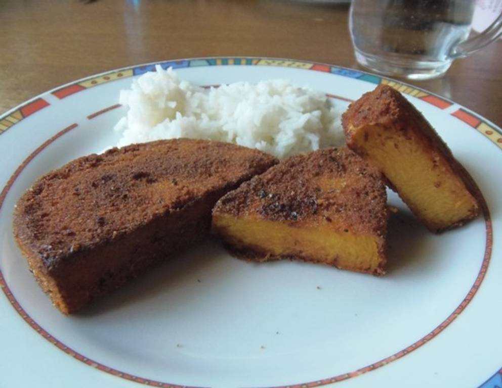 - Die Kürbis-Scheiben salzen und pfeffern, dann in Mehl, den Eiern und zum Schluss in den Bröseln wenden. Brösel gut festdrücken. In einer Pfanne das Öl erhitzen und die Kürbisschnitzel darin bei nicht zu großer Hitze langsam goldgelb backen.