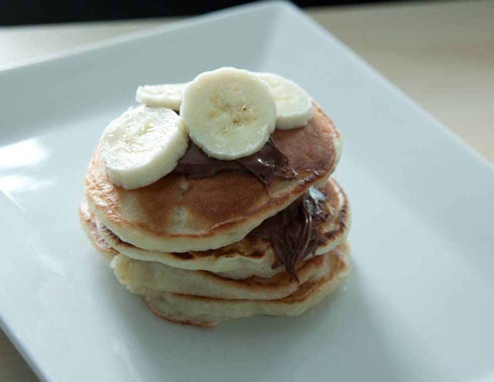 - Jeweils 2 - 3 Pancakes übereinanderschichten, zwischen die einzelnen Pancakes etwas Nutella streichen und sie obenauf mit Bananenstückchen dekorieren.