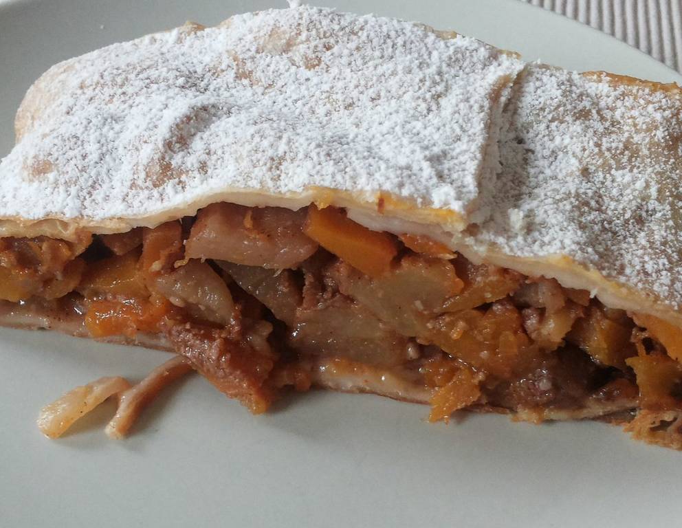 - Für den Apfel-Kürbis-Strudel den Kürbis und die Äpfel schälen und in kleine Stücke schneiden. In einer Pfanne mit etwas Butter weich dünsten.