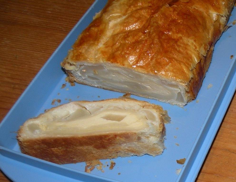 Teig ausrollen, mit verquirltem Eiweiß bestreichen, Topfencreme aufstreichen, am einen Ende 10 cm unbestrichen lassen. Birnenstücke auf die Topfenmasse geben, von der Schmalseite den Teig einrollen, die Rollenenden zusammendrücken, mit der Naht nach unten in eine gefettete Kastenform legen und den Birnen-Topfen-Strudel im vorgeheizten Ofen bei 160 Grad Heißluft etwa eine halbe Stunde backen.