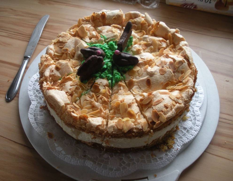 - Für den Eischnee Eiklar und Zucker steif schlagen, auf die zwei Bleche aufteilen, Mandelplättchen auf beide streuen und ca. 20-25 Minuten backen (wird sehr hoch und wellig).