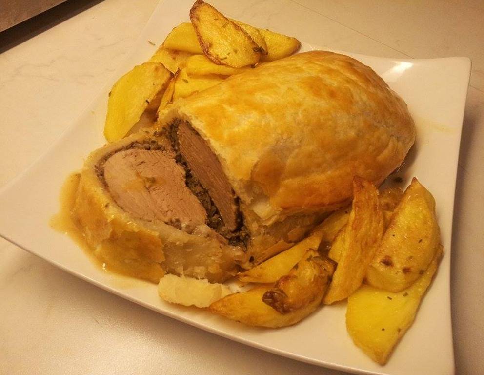 Zum Beef Wellington passend ist eine Pfefferrahmsoße und im Ofen gebackenen Kartoffelspalten.