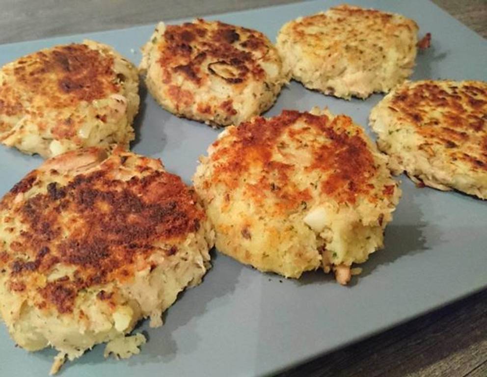 Zu den Thunfischlaibchen schmeckt Kartoffelpüree und grüner Salat.