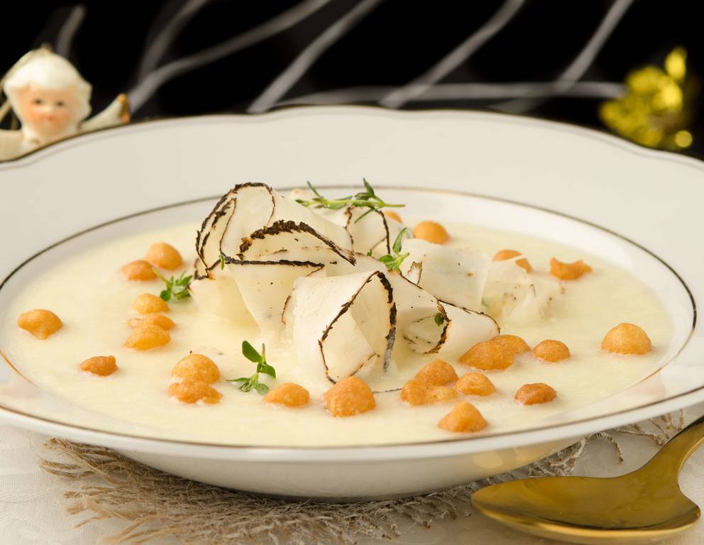 - Die Suppe kurz vor dem Servieren mit einem Stabmixer aufschäumen und in Suppentellern anrichten. Den Schwarzwurzelsalat in die Mitte setzen und mit den Backerbsen garnieren. Die Schwarzwurzel-Suppe mit Backerbsen und Salat noch heiß servieren.