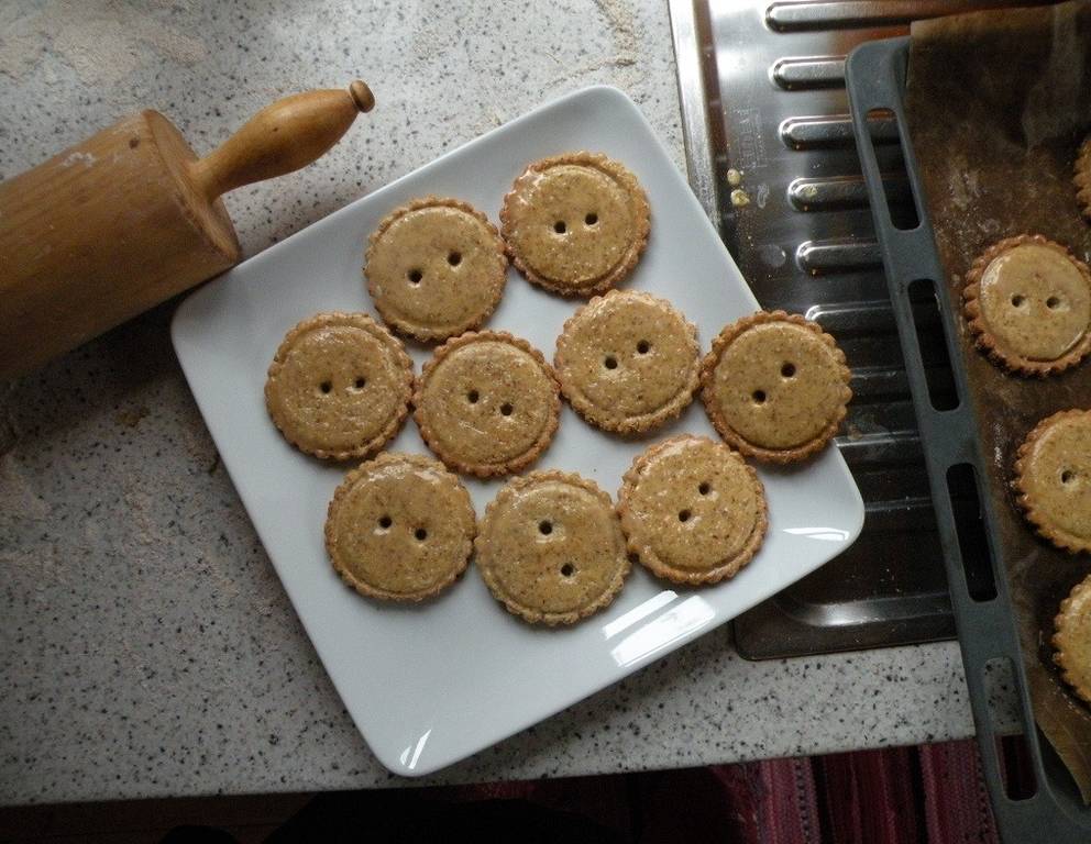 - Mit einem kleineren Glas den Knopfrand aufdrücken und mit einem Strohhalm die Löcher ausstechen, das geht sehr gut! Auf ein Blech mit Backpapier legen.