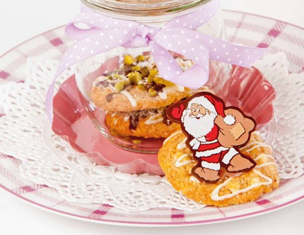 Zur Dekoration mit weißer und dunkler Schokolade Streifen über die Vanille-Rosmarin-Cookies ziehen. Pistazien darüberstreuen. Eventuell einen Schokoaufleger auf den Keks setzen. Setzen Sie dafür einen Tupfen Schokolade auf den Keks, darauf eine Cranberry, darüber wieder einen Tupfen Schokolade und zum Abschluss den Schokoaufleger schräg darüber.