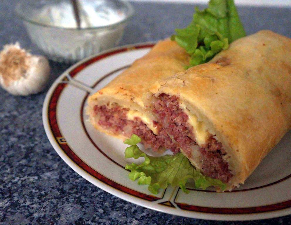 - Den Teig auf einem bemehlten Tuch ausrollen (eventuell mit Öl bestreichen) und ausziehen. Darauf die faschierten Wurstreste, Paprika und Käse verteilen und den Strudel einrollen.