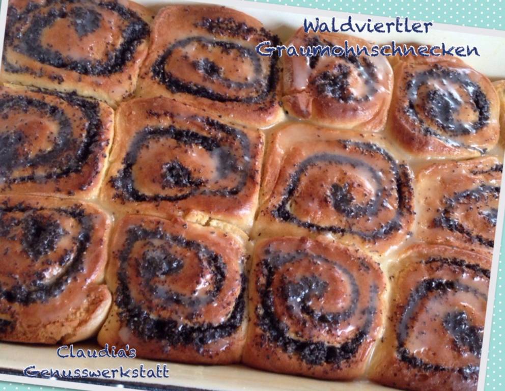 Wer möchte bestreicht die Graumohn-Schnecken noch mit einer Zuckerglasur (Wasser mit Staubzucker verrührt).