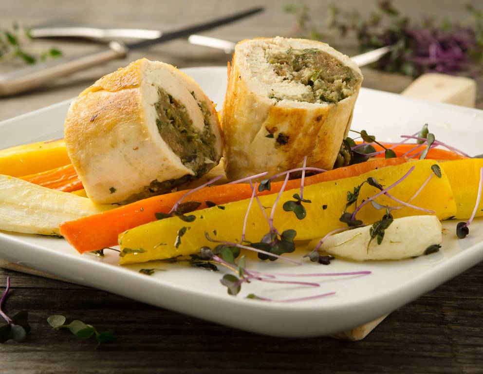 - Das Gemüse auf einem Teller anrichten, die gefüllte Hühnerbrust darauf setzen und mit der Kresse garnieren.