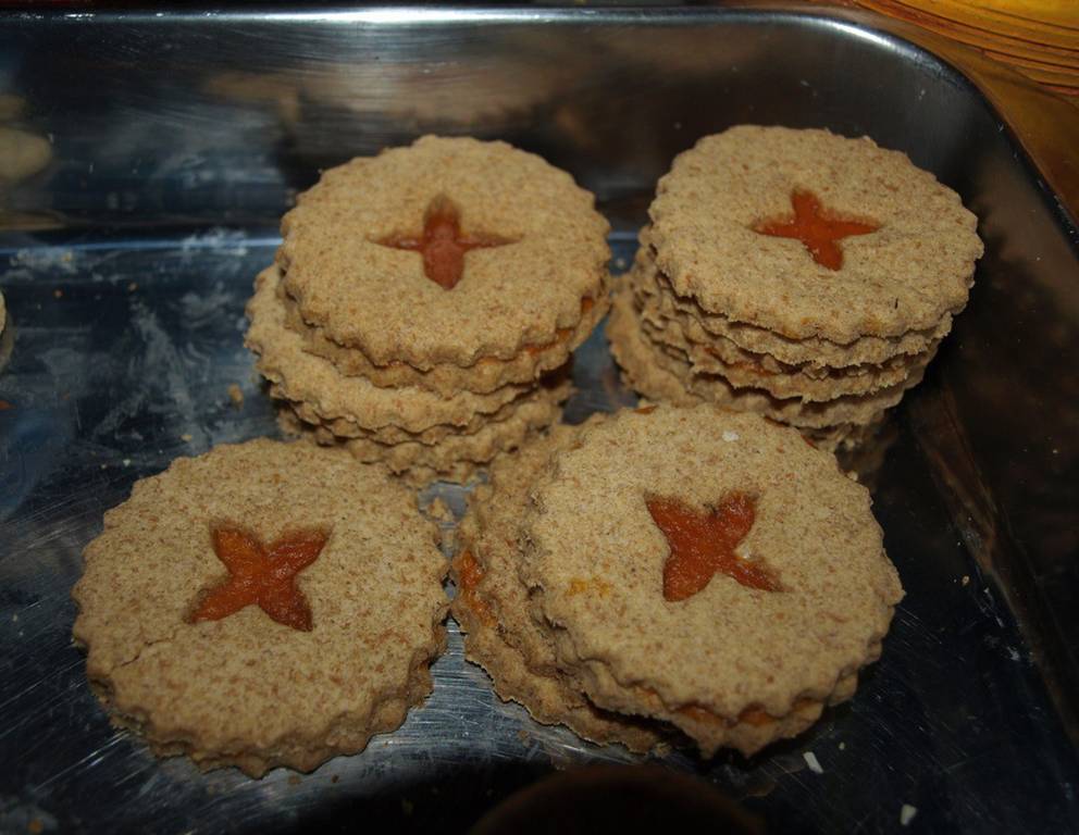 - Bei mittlerer Hitze backen. Auskühlen lassen, die Kreise mit Marillenmarmelade bestreichen und die löchrigen Kreise draufsetzen.