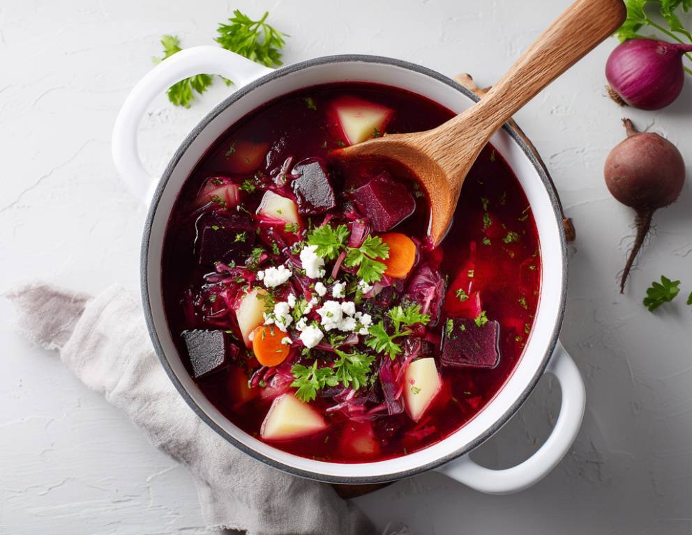 - Kartoffeln, Karotten und Kraut untermischen und alles noch etwa 20 Minuten köcheln lassen. Den Eintopf mit Salz und Pfeffer abschmecken. Den Käse zerbröckeln und darüber verteilen. Petersilie über den Rote-Rüben-Eintopf streuen.